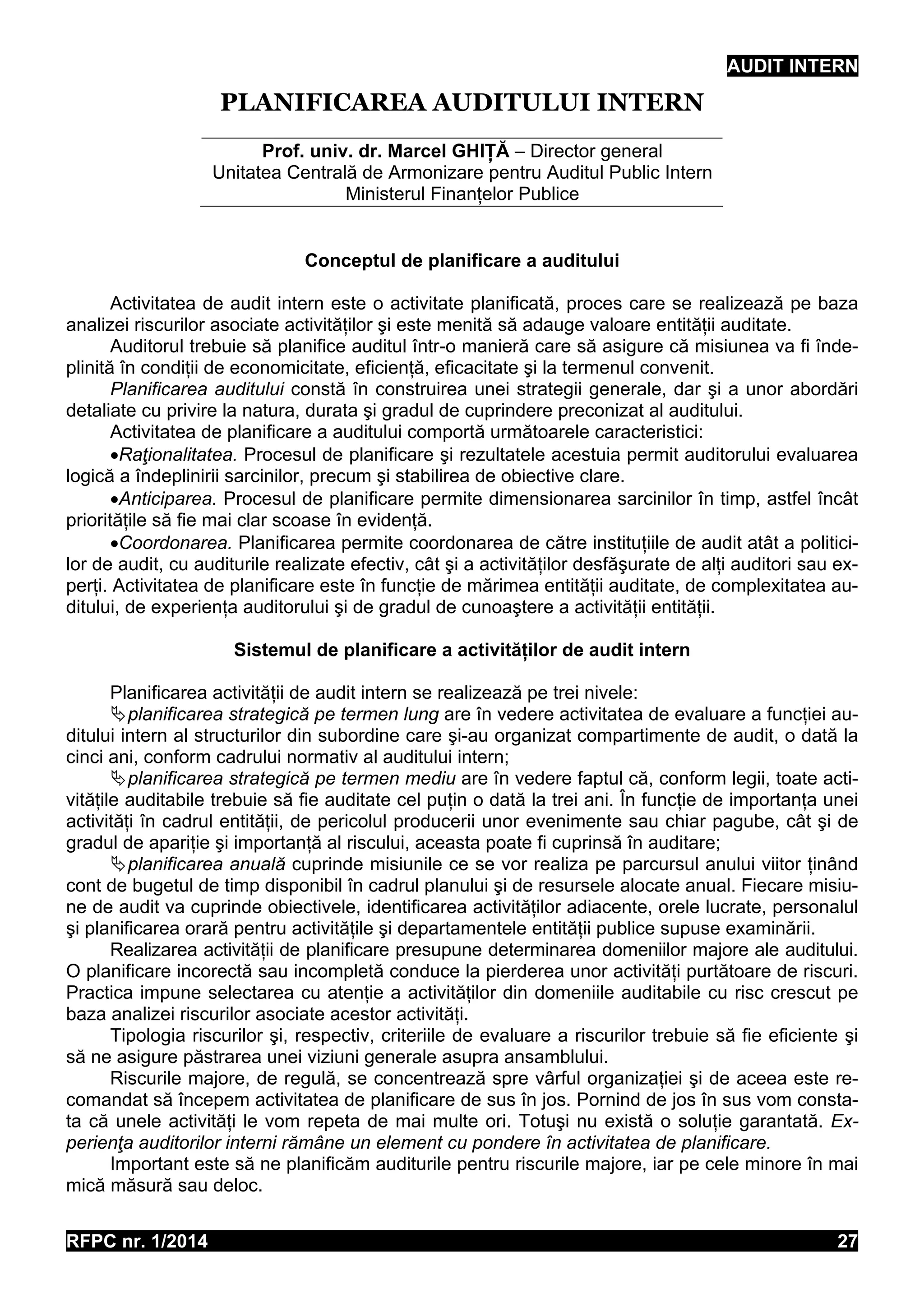 Documentul descrie planificarea auditului intern ca un proces esențial bazat pe analiza riscurilor, care adaugă valoare entității auditate și trebuie realizat cu coordonare și raționalitate. Planificarea se desfășoară pe trei nivele: strategic pe termen lung, mediu și anual, având în vedere complexitatea entității și obiectivele de audit. De asemenea, documentul subliniază importanța unui model de evaluare a riscurilor pentru prioritizarea activităților de audit, asigurând astfel utilizarea eficientă a resurselor.