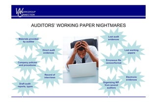The document describes an audit management system called Audit Management System IA that can automate the audit process. It allows auditors to plan audits, document controls and test plans, manage issues, and track resources. The system provides features for audit administration, documentation, issue management, and resource management. It aims to help auditors achieve a paperless audit process.