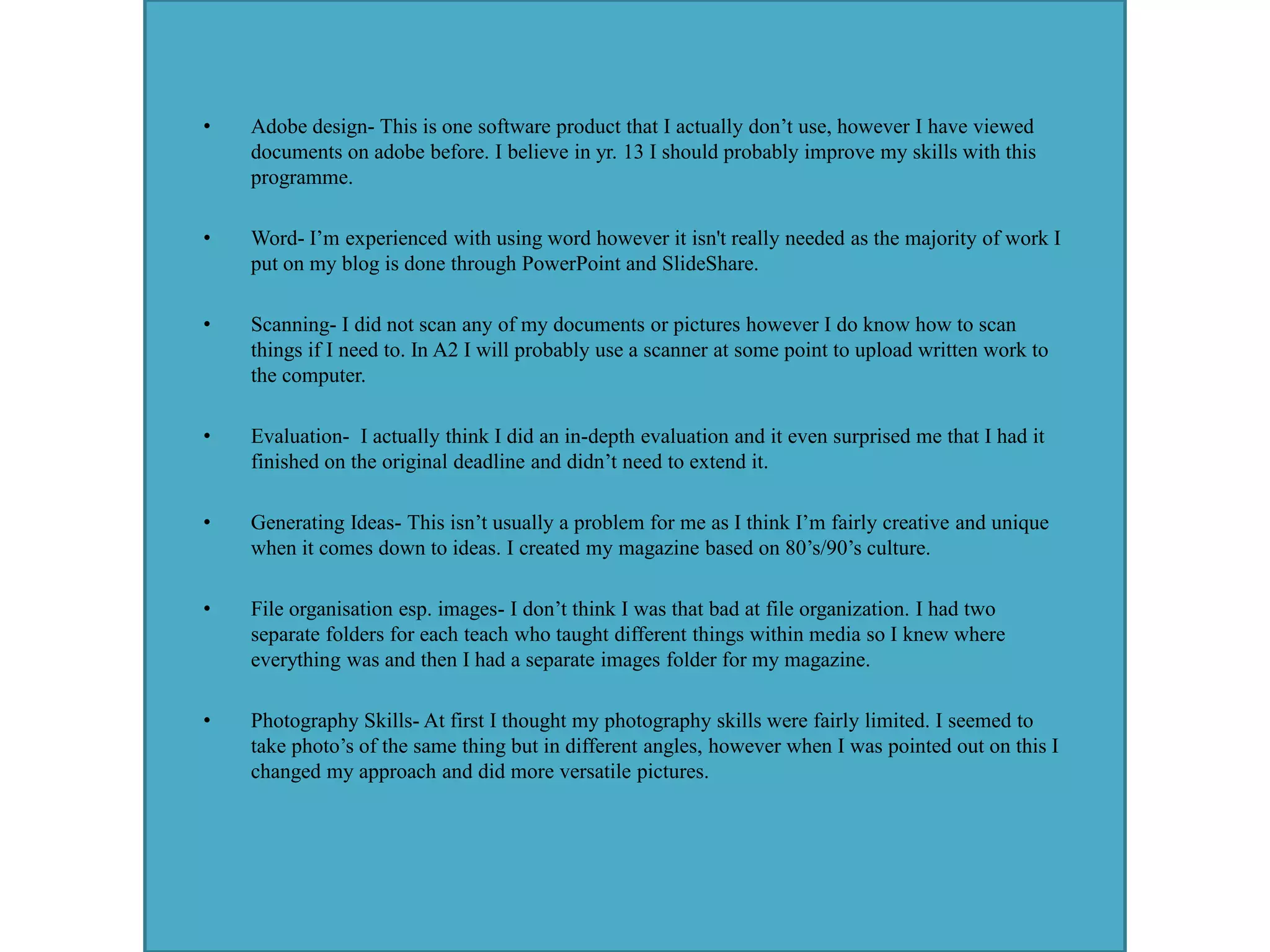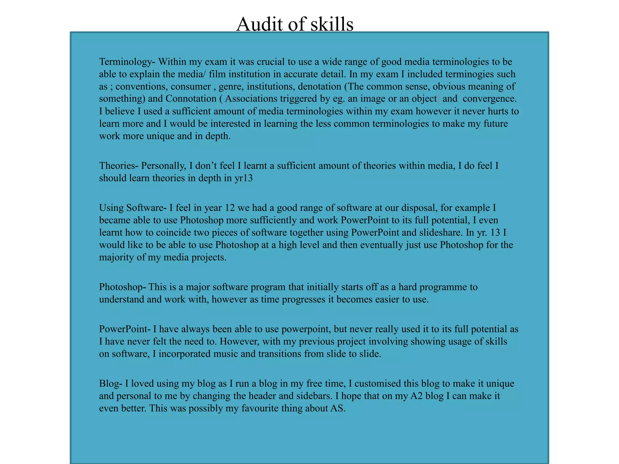 The document discusses the author's skills in various areas related to media studies, including terminology, theories, and software programs. The author felt proficient in using terminology in exams but wanted to learn less common terms. They also wanted to learn theories in more depth. While skilled in programs like Photoshop and PowerPoint, the author expressed interest in gaining higher proficiency in Photoshop and learning Adobe design software. Areas like blogging, file organization and photography the author believed could be improved further.