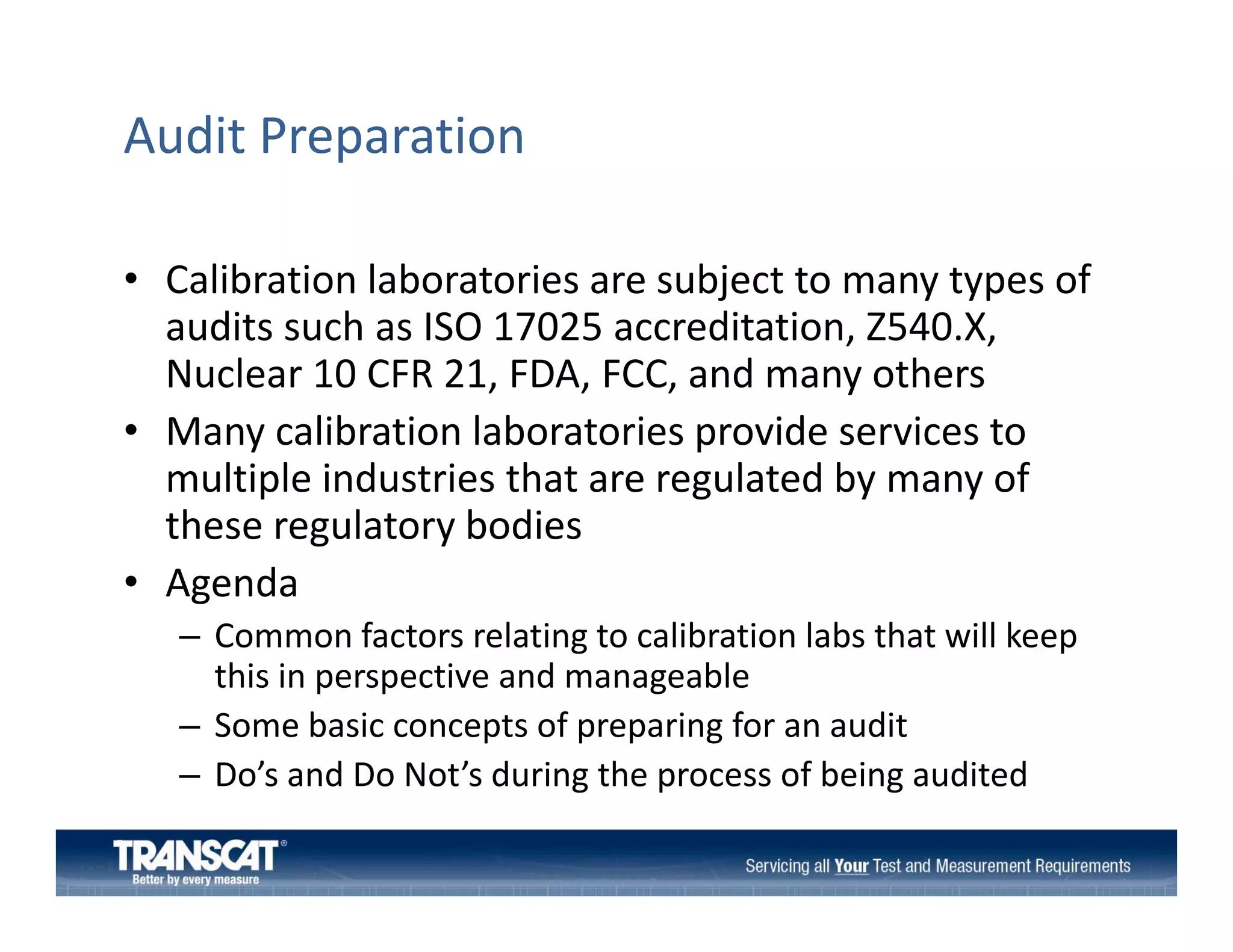 The document outlines the preparation process for calibration laboratory audits, detailing various standards and requirements, particularly ISO/IEC 17025. It emphasizes the importance of competent personnel, quality systems, measurement traceability, and proper handling of measurement and test equipment. Additionally, the document includes guidance on conducting audits, do's and don'ts, and the significance of developing a clear scope of capabilities.