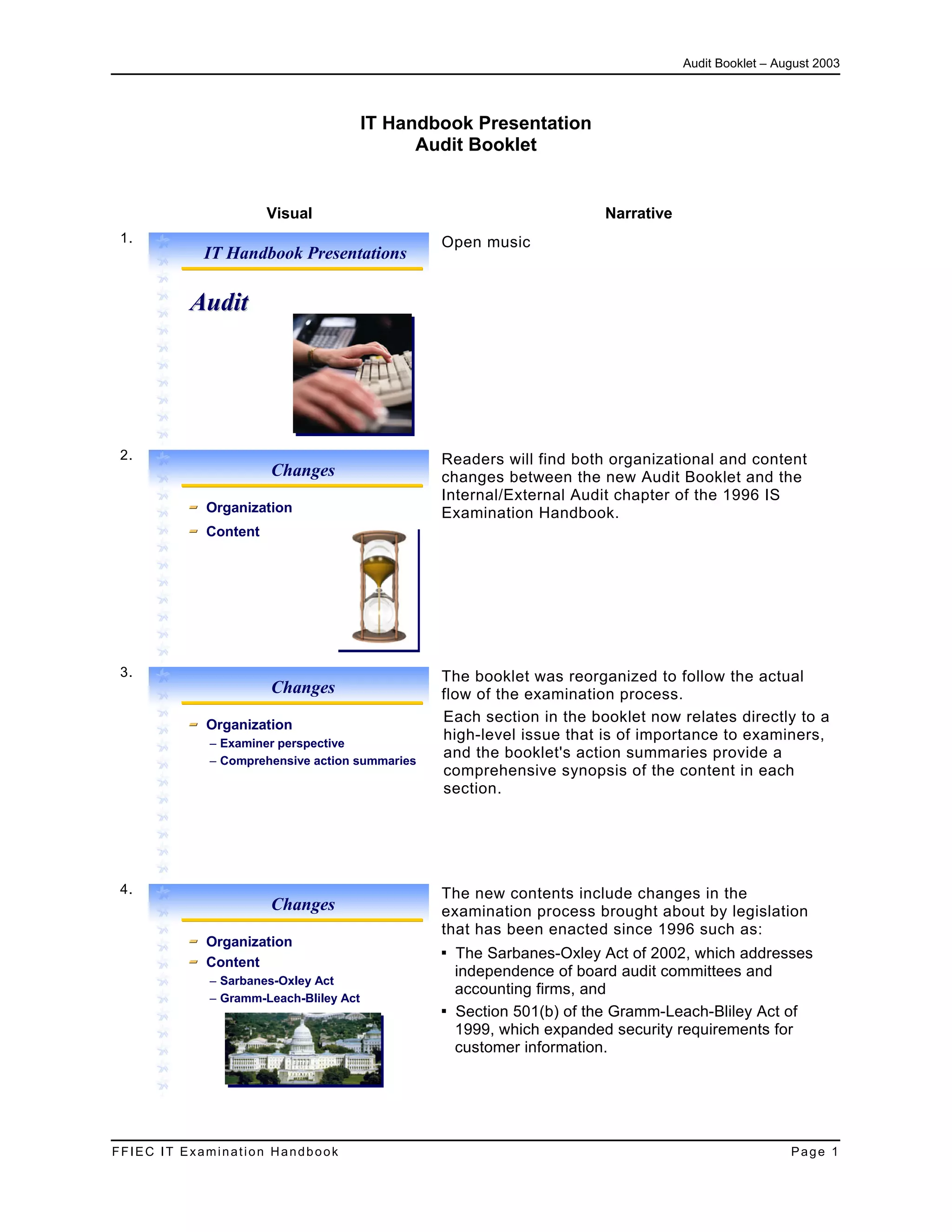 The document is an overview of the Audit Booklet published in August 2003 by the FFIEC IT Examination Handbook. It summarizes changes made to the booklet, including reorganizing it to follow the examination process flow. New contents were added to address legislation like Sarbanes-Oxley and Gramm-Leach-Bliley Acts. It also specifically addresses outsourcing IT audits and third-party reviews. The booklet is organized into sections on audit roles and responsibilities, independence of internal audits, developing an internal audit program, risk assessment, audit plans, and additional topics like outsourcing. Appendices include examination procedures and resources.