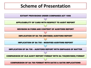 The document summarizes the key changes introduced by the Standards on Auditing (SA) 700 (Revised), SA 705, and SA 706 issued by the Auditing and Assurance Standards Board of the Institute of Chartered Accountants of India regarding the format and content of audit reports. Specifically, it provides a comparative analysis of the old versus new audit report formats, explains the types of modified audit opinions under SA 705, and the use of emphasis of matter and other matter paragraphs in audit reports as per SA 706. The document aims to explain the implications of the revised standards for auditors in India.