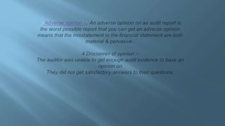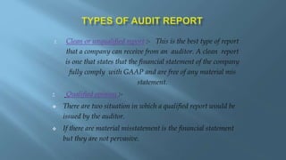 The document discusses audit reports, which reflect the auditor's opinion on the accuracy of a company's financial statements and protect shareholders' interests. It describes different types of audit opinions, such as clean or unqualified reports and qualified opinions, and outlines the structure and components of an audit report. Additionally, it highlights the advantages and disadvantages of auditing, including compliance and cost factors.