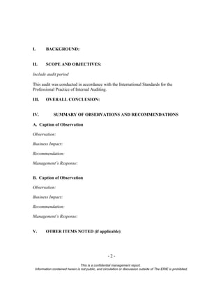 This internal audit report summarizes an audit conducted of Company by Lead Auditor and Audit Team. The report includes sections on background, scope and objectives of the audit period, overall conclusion, and summary of observations and recommendations for two captions with observations of issues, business impacts, recommendations, and management responses. The document and information within is confidential and prohibited from public circulation or discussion outside of Company.