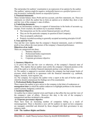 3. It discusses the objectives, duties, and rights of auditors, as well as the parties that benefit from audited financial statements such as creditors, customers, bankers, and shareholders.