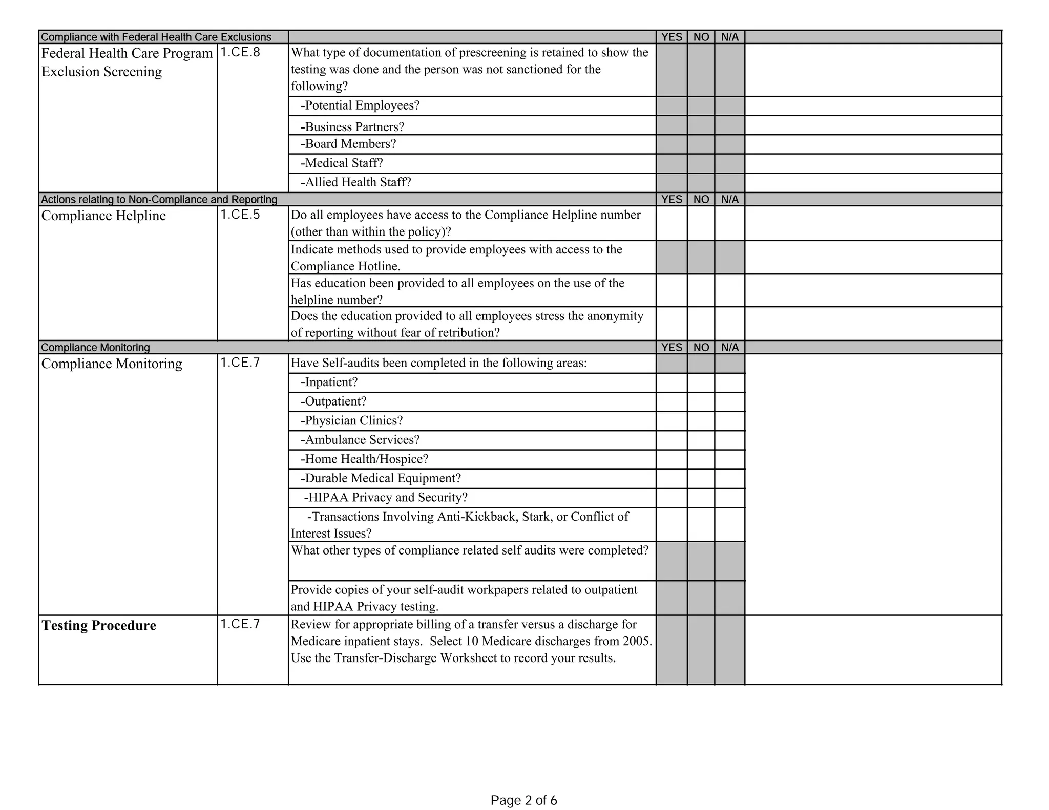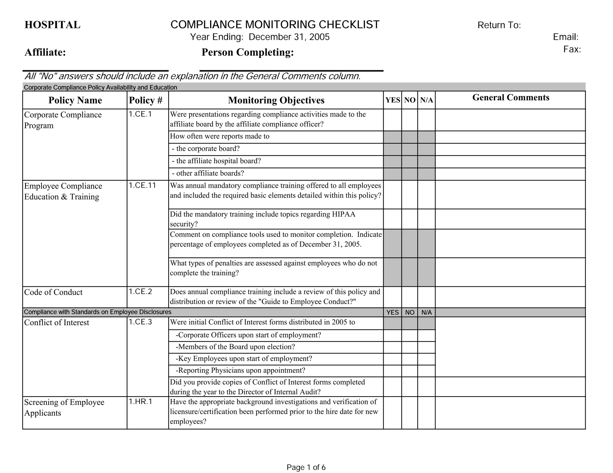 This document is a hospital compliance monitoring checklist that contains questions about various hospital compliance policies and procedures for the year ending December 31, 2005. It includes questions about the availability of compliance policies, employee training, conflict of interest disclosures, billing compliance, physician contracts, acquisitions/divestitures, and other compliance-related topics. Affiliates are asked to indicate yes, no, or N/A answers and provide explanations for any no responses in a comments section.