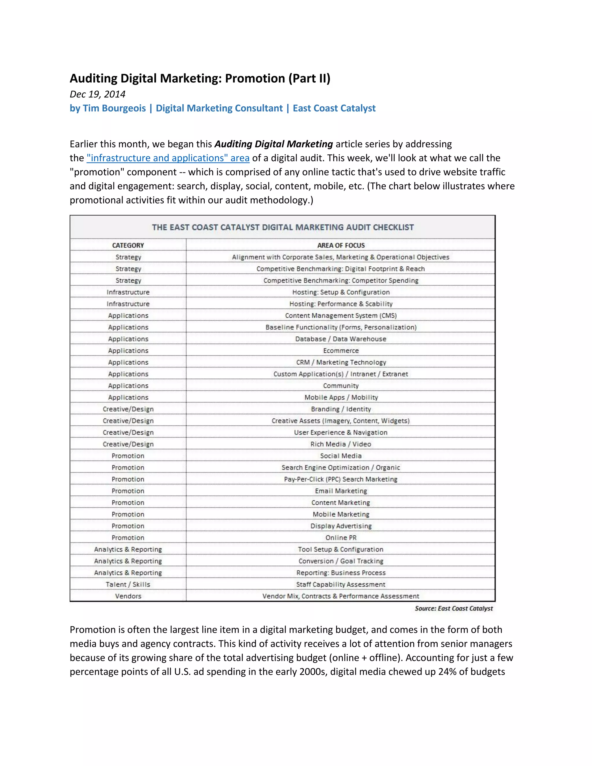 The document discusses the promotion component of digital marketing audits, focusing on strategies to enhance website traffic and engagement through various online tactics. It highlights the significant growth in digital advertising spending, the importance of optimizing search marketing operations, and the necessity of integrating mobile and multichannel strategies. Additionally, it emphasizes the potential effectiveness of email newsletters as marketing tools and offers actionable recommendations for improving digital marketing efforts in 2015.