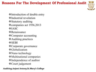 This document discusses the introduction, objectives, and advantages of auditing. It covers the history of auditing from double-entry bookkeeping to modern practices. The objectives of auditing are to verify the accuracy of financial statements and detect errors and fraud. Auditing ensures the primary objective of reporting accurate financial information to management and compliance with laws. It also aims to detect and prevent errors, frauds, and false representations in financial records through systematic examination of books and accounts.