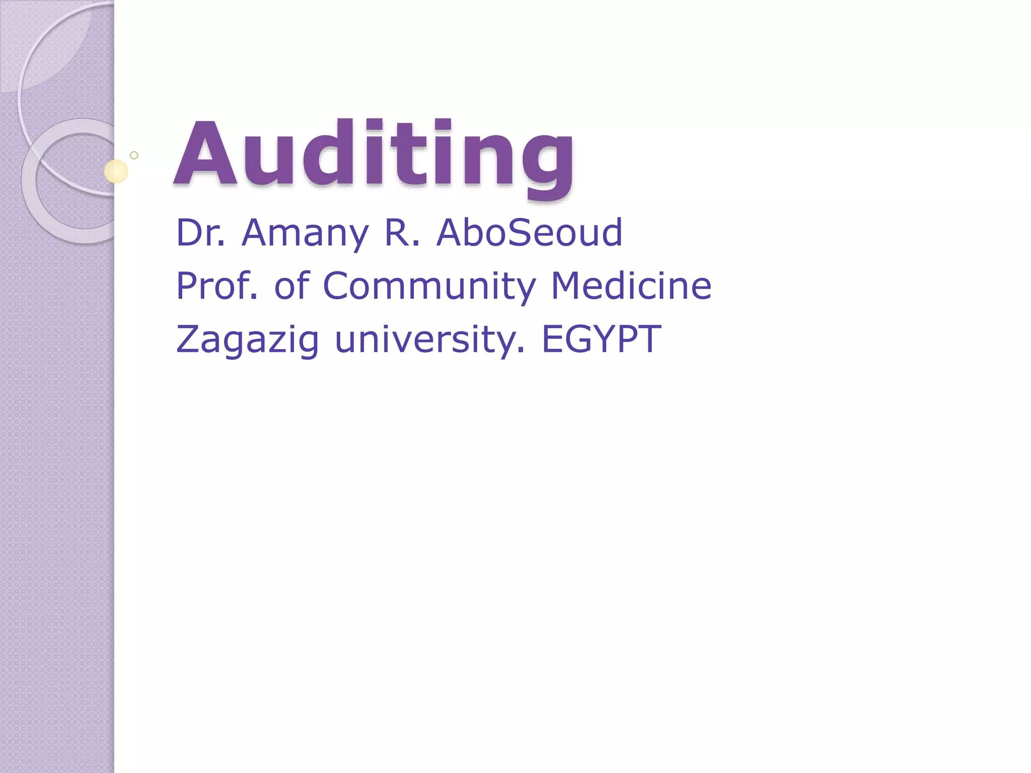 Auditing is an important part of quality assurance and quality management. It involves systematically and objectively evaluating processes, systems, or services against predefined standards to ensure compliance. The goals of auditing are to find any deviations from these standards, analyze their causes, and implement changes to improve performance and prevent issues from reoccurring. Auditing can be internal, conducted by an organization's own staff, or external, conducted by independent third parties. It follows a standard process of planning, data collection on site, analysis, reporting, and verifying that any necessary corrective actions were successfully implemented.