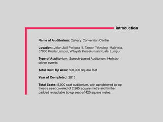 The Calvary Convention Centre (CCC) in Kuala Lumpur, Malaysia is a 5,000-seat, multi-purpose auditorium designed for both speeches and musical performances. Through the strategic use of materials and acoustic treatments, the CCC achieves a reverberation time of 0.9 seconds, making it suitable for its primary function as a speech-based venue. Absorptive materials like carpeting and upholstered seats help control reverberation, while the concave wall and ceiling shapes aid in concentrating sound toward the audience. The auditorium design and acoustic treatments demonstrate how spaces can be flexibly designed for different event needs through consideration of materials and room geometry.