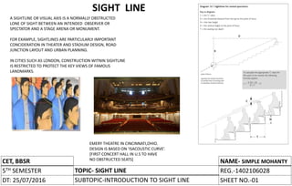 This document discusses sight lines and their importance in architectural design. It provides context on sight lines for theater and stadium design, noting that clear sight lines allow spectators to see all areas of the stage or field. It also discusses factors like seating arrangement, viewing angles, and the use of the C-value equation to determine required step heights while maintaining clear sight lines. Maintaining good sight lines is important for audience experience and enjoyment of a performance.