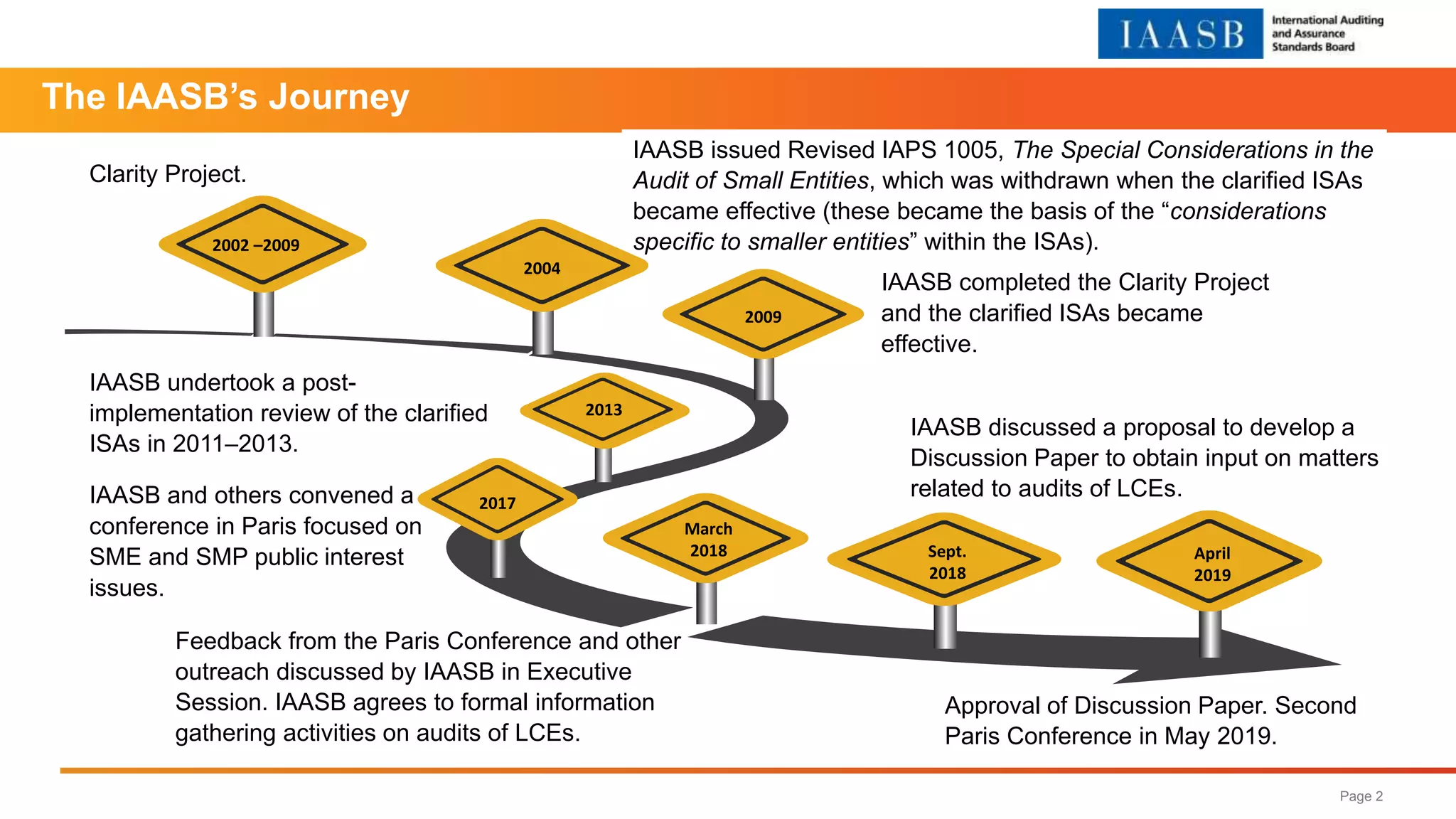 The IAASB is reviewing audits of less complex entities (LCEs) to address challenges related to the application of International Standards on Auditing (ISAs). A discussion paper was published in April 2019 to gather feedback, with a deadline for comments set for September 12, 2019, and several potential actions for revising the ISAs included. The IAASB plans to analyze feedback and make recommendations for future direction in early 2020.