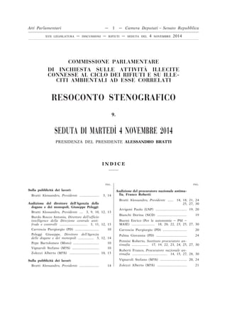 Il documento riporta un resoconto della seduta della commissione parlamentare di inchiesta sulle attività illecite nel ciclo dei rifiuti, tenutasi il 4 novembre 2014, durante la quale sono stati auditi diversi esperti tra cui il direttore dell'agenzia delle dogane e il procuratore nazionale antimafia. Sono emersi importanti temi riguardanti il traffico transfrontaliero di rifiuti, in particolare quelli radioattivi, e la necessità di rafforzare la cooperazione internazionale per il contrasto a tali attività illecite. L'agenzia delle dogane ha segnalato casi di rifiuti pericolosi e ha illustrato strategie per migliorare il monitoraggio e il controllo delle filiere di smaltimento e riciclo.