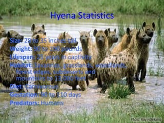 Hyenas are carnivorous mammals that typically live in savannas, grasslands, woodlands, and forests up to 13,000 feet in elevation. They range in size from 28-35 inches tall and weigh 90-190 pounds. Hyenas have a lifespan of around 25 years in captivity. They communicate through vocalizations like wailing calls and laughter, and mark their territory with anal gland secretions. Their only natural predator is humans.