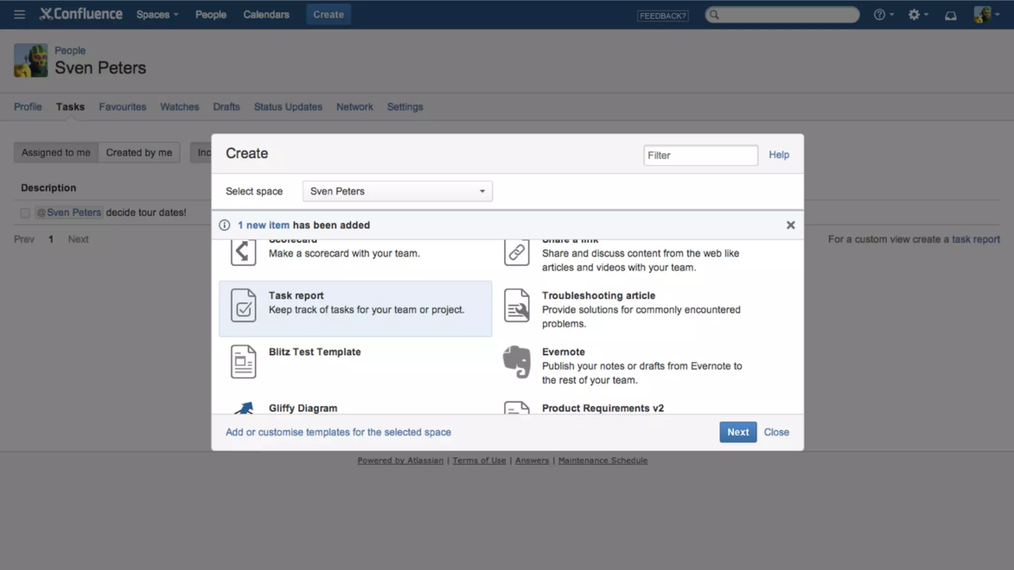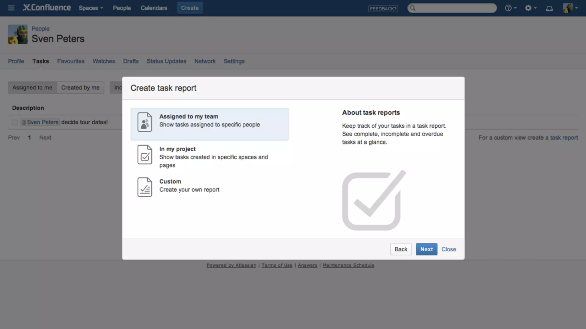 Sven Peters provides an overview of upcoming Atlassian events in September, June, and April-May in various cities. The document also summarizes new features for Confluence, including improved task management with the ability to mention people, add tasks to lists from different sources, and generate task reports. It notes that some slides contain restricted content and are not for public discussion.