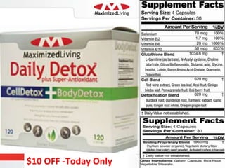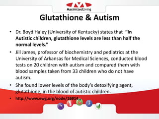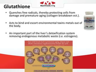 This document discusses the pervasive toxicity of modern life and provides recommendations for reducing toxic exposure and supporting the body's detoxification processes. It notes that chemicals are now present in many household and personal care products, food/beverages, and the built environment. Specific toxic substances discussed include heavy metals, pesticides, plastics, and electromagnetic fields. The document recommends avoiding these toxins, supporting detoxification with supplements like glutathione, using activated carbon, and addressing structural issues like heavy metal amalgam fillings and spinal misalignments that can impair detoxification. Overall it presents a model of toxicity as a primary driver of chronic disease and advocates lifestyle changes to reduce the toxic burden on the body.