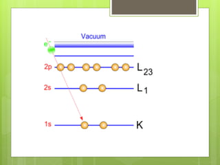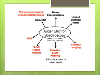 Auger electron spectroscopy (AES) is an analytical technique used to analyze the surface chemistry of materials. It works by (1) removing a core electron from the sample using a high-energy electron beam, (2) causing an electron to fill the resulting vacancy and emit an Auger electron, and (3) analyzing the kinetic energy of the emitted Auger electrons to determine the elemental composition of the top 1-10 nanometers of the sample surface. AES can also be used to create depth profiles by combining it with argon ion sputtering to sequentially remove layers from the surface. Typical applications of AES include analyzing thin film layers, surface oxides, and corrosion processes.