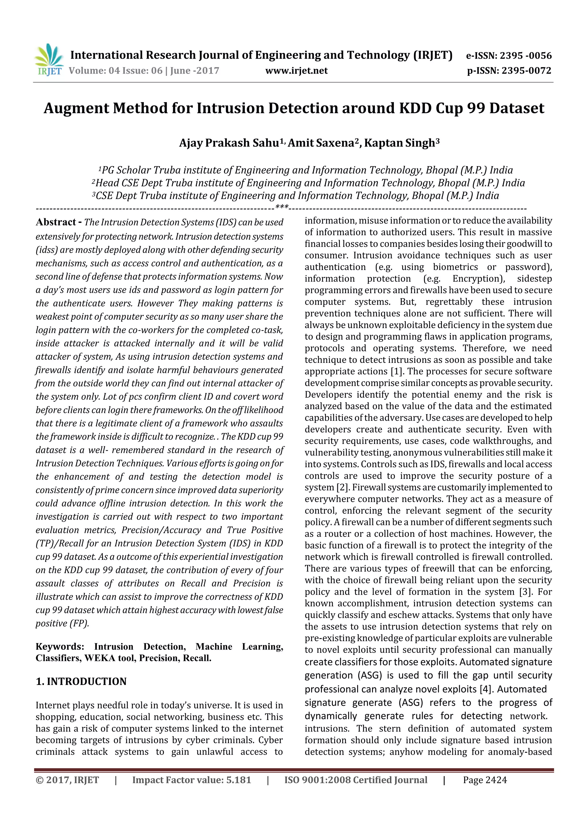 This document discusses augmenting methods for intrusion detection using the KDD Cup 99 dataset. It aims to improve detection accuracy and reduce false positives. The key points are: