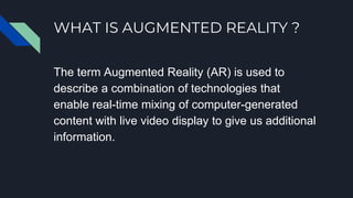 Augmented reality (AR) combines computer-generated content with live video to enhance user interaction with the real world, relying on key components like tracking, display tech, and real-time rendering. Applications of AR span various fields including medicine, military, education, and navigation, while offering advantages such as enhanced experiences and knowledge sharing, but also facing challenges like security, performance, and hardware limitations. Future research is needed to improve recognition systems and middleware for more effective AR implementations.