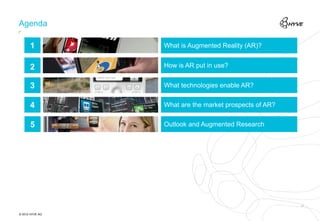 Augmented reality has the potential to significantly impact many industries and aspects of everyday life. The technology enables virtual objects and information to be overlaid on the real world. Current applications include using AR for entertainment, marketing, education, and navigation. For AR to be widely adopted, improvements are needed in areas such as display technologies, user interfaces, internet connectivity, geolocation data, and energy storage. With continued advances, AR could transform how people interact with digital information while engaging with the physical world.