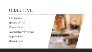 Augmented reality (AR) is a technology that overlays digital content onto the real world using computer vision to recognize and understand the environment around the user. First developed in 1968, AR has evolved significantly, with predictions suggesting its market value will reach $133 billion by 2023, influencing various industries like gaming, healthcare, and education. While AR enhances user experience and interaction, it also faces challenges such as high development costs and privacy concerns.
