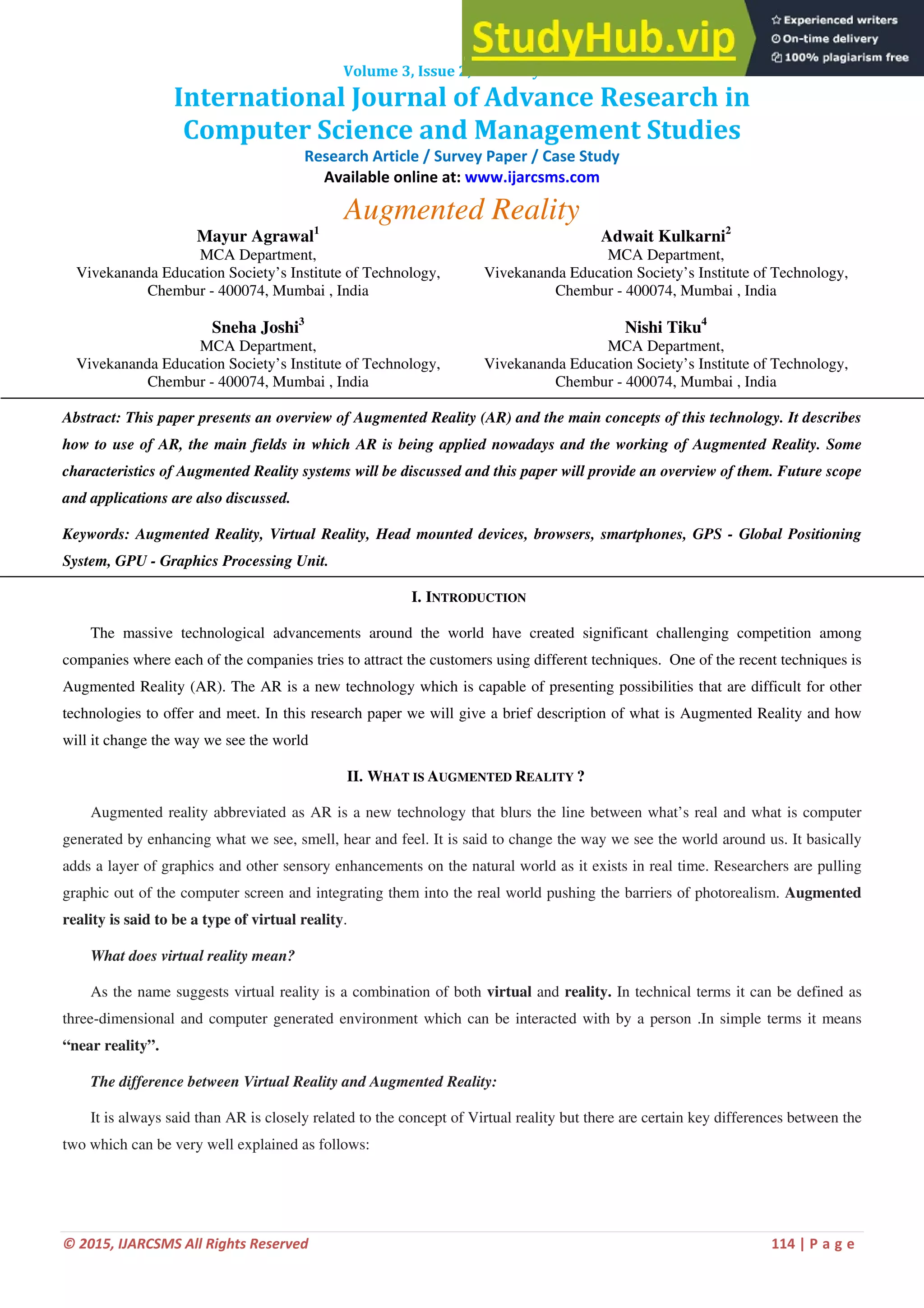 The document discusses augmented reality (AR), which enhances what users see in the real world by overlaying digital graphics. It defines AR and distinguishes it from virtual reality. AR uses devices like smartphones and head-mounted displays to integrate virtual objects into the real environment in real-time. Examples of current AR applications include using phones as "magic windows" to access information by pointing the camera at objects, immersive AR games, and location-based information displayed through devices. The document outlines key components and features needed for AR applications.
