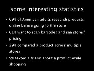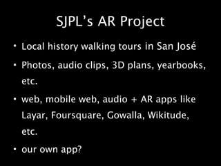 The document is a primer on augmented reality (AR) specifically tailored for libraries, detailing its definition, evolution through various internet stages, and practical applications. It discusses the importance of AR in consumer behavior and retail experiences, highlighting statistics on how consumers engage with products online. Additionally, it mentions various AR projects and resources available for development, as well as societal implications such as privacy concerns and the impact on connectivity.