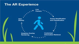Augmented reality (AR) enhances real-world environments by overlaying digital information and objects onto the real world. The key differences between AR and virtual reality (VR) are that AR enhances real environments while VR completely immerses users in simulated environments. Major AR companies are developing AR applications in fields like education, tourism, and healthcare by building AR software and components like monitors and mobile views.