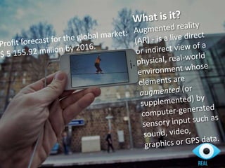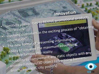 Realeye is an innovative Russian advertising web studio that creates augmented reality experiences to enhance client engagement and advertising effectiveness. Their platform allows for rapid updates and implementation of interactive advertisements, while promoting customer loyalty among younger demographics. The company offers unique solutions including individual applications and a unified advertising platform that integrates various client campaigns within an augmented reality environment.