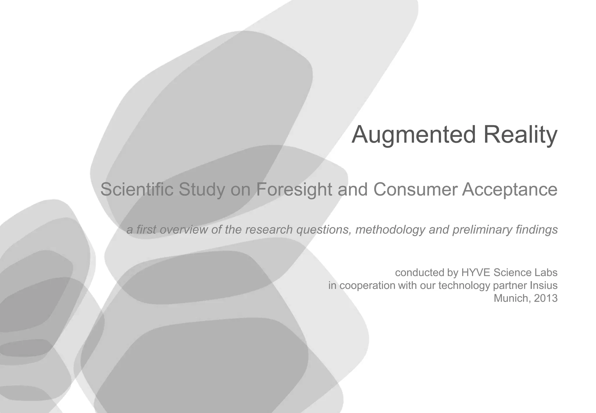 The document provides a summary of preliminary findings from a scientific study on consumer acceptance and foresight of augmented reality (AR) conducted by HYVE Science Labs in cooperation with technology partner Insius. Key findings include: