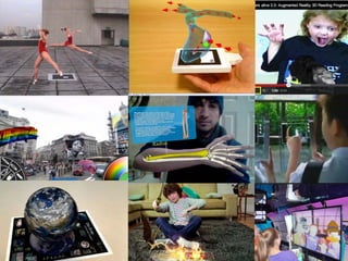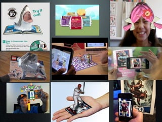 This document discusses augmented reality (AR) and its potential applications in education. It defines AR as a live view of the real world that is augmented by computer-generated information. Examples of AR include using markers, QR codes, location data, and gestures. The document explores how AR could be used for discovery, skills training, spatial learning, impossible interactions, and augmented reading. It provides examples of AR education projects and tools for creating AR content, suggesting AR has potential to enhance learning experiences.
