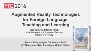 The document discusses a project at Indiana University that utilizes augmented reality (AR) technologies to enhance foreign language teaching, specifically in a beginner's Spanish course. It outlines the methodology, including the use of Aurasma to create interactive learning experiences, and assesses the impact on student vocabulary, grammar, and comprehension skills through surveys and usage statistics. Future directions include refining video design and incorporating advanced AR features like 360-degree videos.