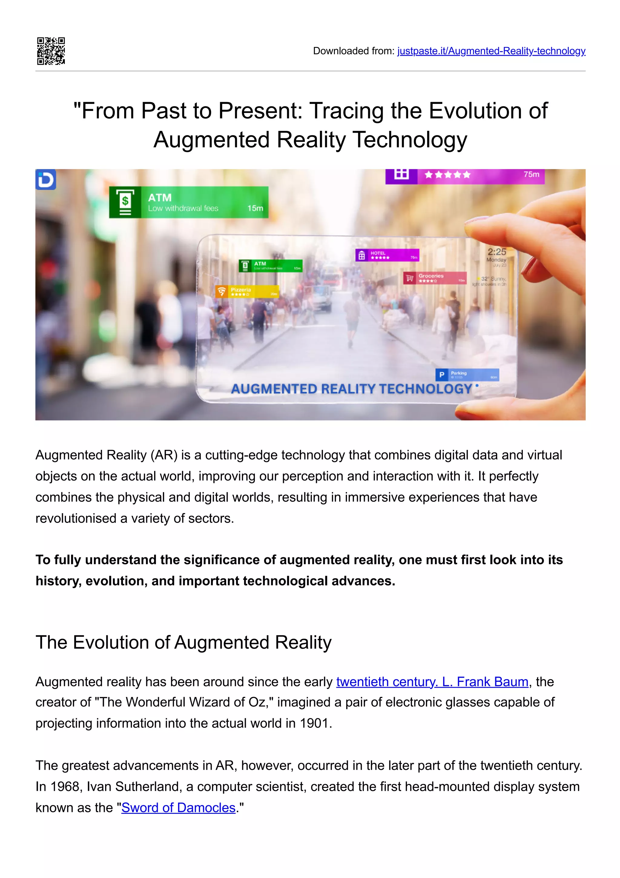 Augmented reality (AR) enhances our perception of and interaction with the real world by overlaying digital information and objects onto it. AR has evolved from early concepts in the 20th century to today's applications across industries like gaming, education, healthcare, and retail. Key AR technologies include tracking systems, display devices, computer vision, and 3D graphics. The future of AR is promising as wearables, 5G, and AI further improve AR experiences with more compact and immersive headsets and seamless integration with IoT devices.
