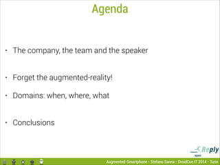 The document discusses the development of augmented smartphones utilizing Android technology to enhance interaction with the environment. It highlights the capabilities of the Open Reply team, showcasing their expertise in Android applications and augmented reality, including user activity recognition and location services. The presentation emphasizes the importance of adapting applications to user context and behaviors based on time, location, and sensor data for a more responsive user experience.
