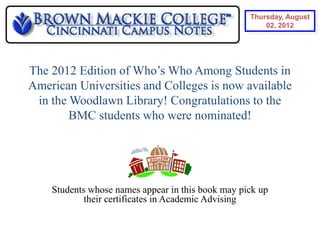 The document provides information about various events, deadlines, and resources for students at a university. It announces that the Who's Who book is available with certificates for nominated students. It advertises sign-ups for a holiday singing CD, senior volunteer opportunities, and completing the FAFSA. It provides details on financial aid, Ohio state grants, and getting help. It also shares announcements about scholarships, make-up classes, medical club meetings, job fairs, and buying textbooks.