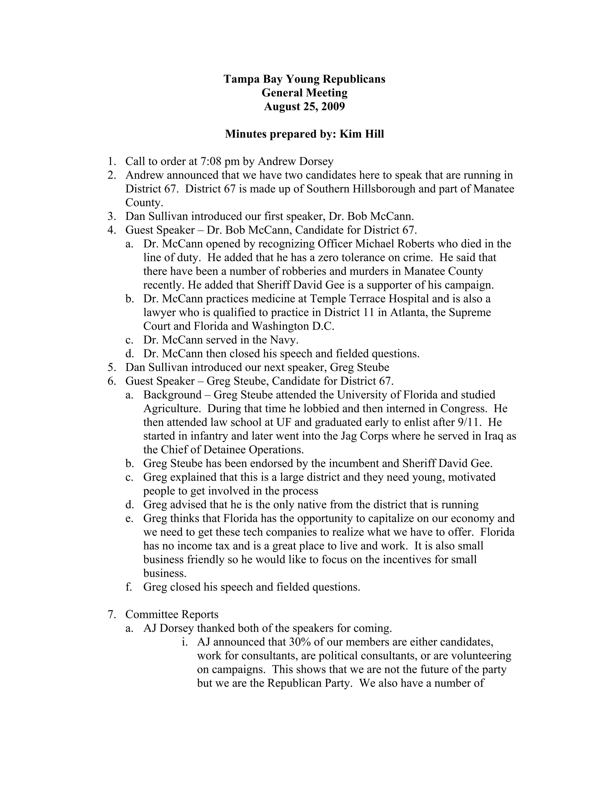 The Tampa Bay Young Republicans held their general meeting on August 25, 2009. Two candidates, Dr. Bob McCann and Greg Steube, spoke about their campaigns for District 67. Various committee reports were provided, including upcoming social and volunteer events. New business discussed the College Republicans' 9/11 flag project and an upcoming 2nd Amendment Club meeting with Sheriff David Gee as guest speaker. The meeting adjourned at 8:19 pm.