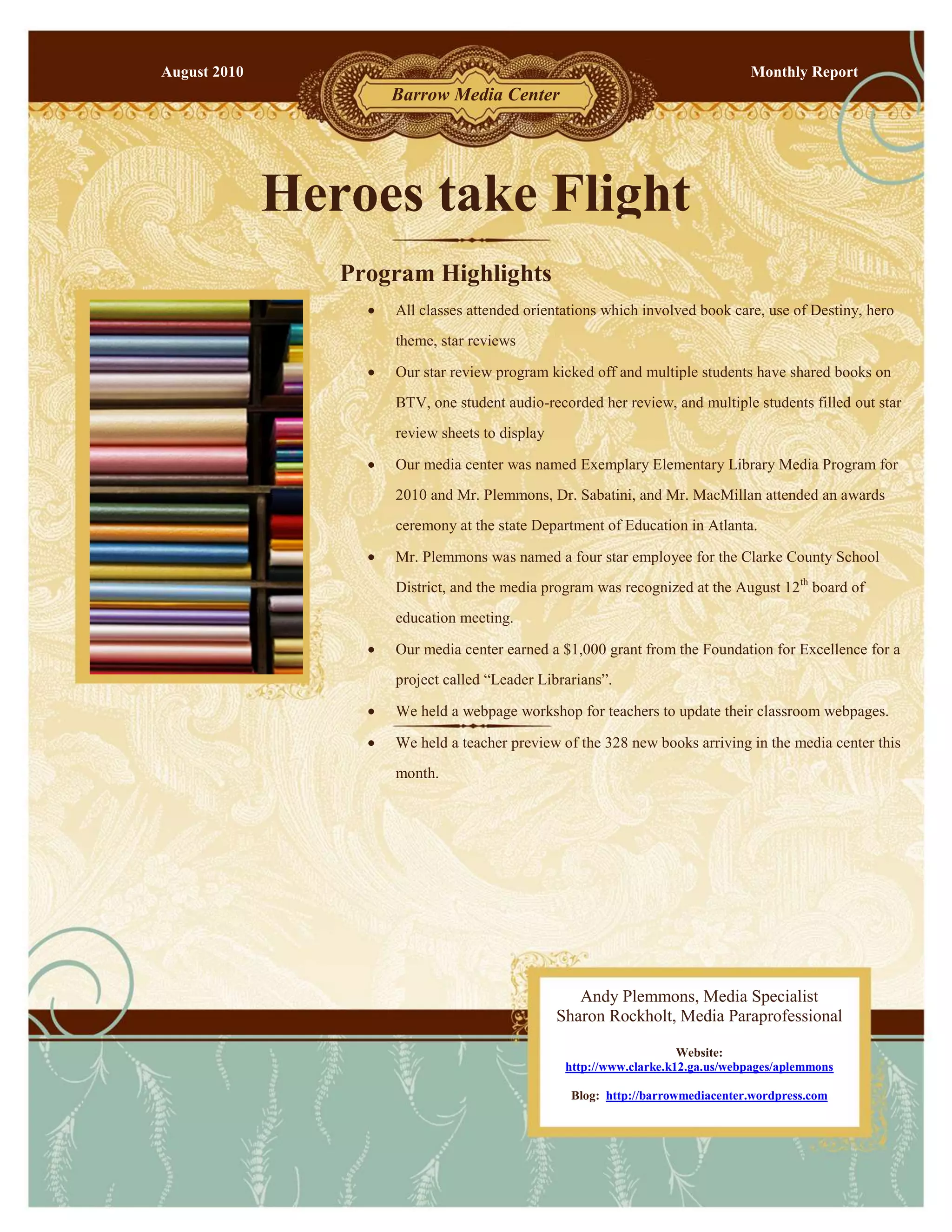 During August 2010, Barrow Media Center conducted orientations and launched a star review program where students engaged in book reviews. The center was recognized as an exemplary elementary library and received a $1,000 grant for a 'leader librarians' project, while 382 new books were introduced for teachers to preview. Additional highlights include increased media center patron visits and the initiation of social media outreach.