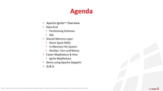 The document provides an overview of Apache Ignite, an in-memory data fabric that supports high-performance applications with capabilities like SQL processing, shared memory, and integration with Spark and Hadoop. It highlights features such as data grids, fault tolerance, and management tools, emphasizing its open-source nature and community involvement. The document also outlines various deployment modes and the roadmap for future developments, including interactive SQL functionalities.