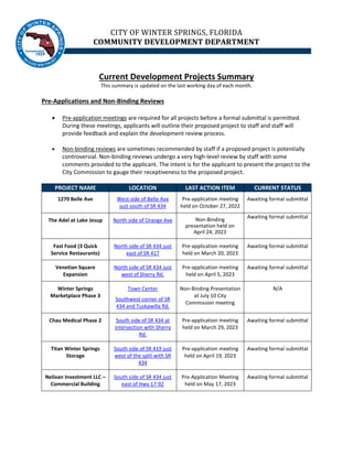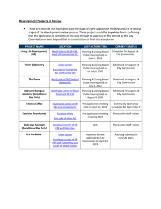 The City of Winter Springs, Florida, is maintaining a summary of current development projects, updated at the end of each month. It categorizes projects into pre-applications, projects in review, and those under construction, detailing their current statuses and future actions. Notable projects include The Adel at Lake Jesup and the expansion of Venetian Square, both awaiting formal submissions.