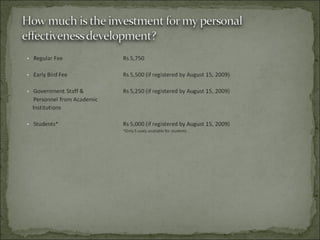 The document details a two-day workshop on 'Applied NLP for Enhanced Personal Effectiveness' taking place in Chennai from August 29-30, 2009. Participants, including managers, trainers, and students, will learn NLP methodologies to enhance personal and professional success by influencing experiences and making empowering choices. The trainer, Shahir, is a certified NLP practitioner with extensive experience in HR and talent management, and will guide attendees in utilizing NLP techniques for improved performance and productivity.