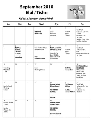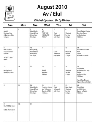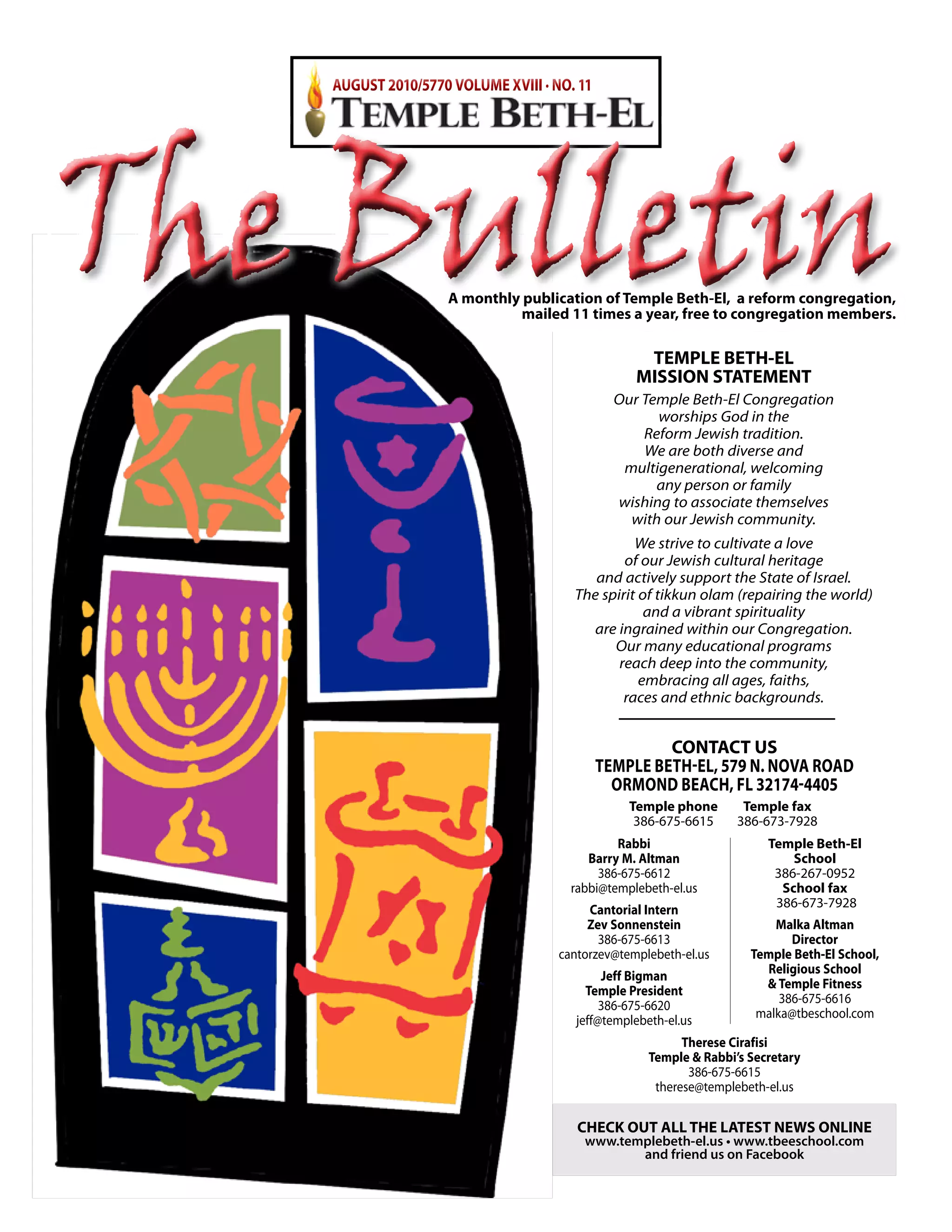 This document provides information about Temple Beth-El, a Reform Jewish congregation in Ormond Beach, Florida. It includes the congregation's mission statement, details about educational and religious programs, a list of services and events for the month of August 2010, and contact information for board members and committees. It also features an article by Anat Hoffman regarding the lack of civil rights for non-Orthodox Jews in Israel.