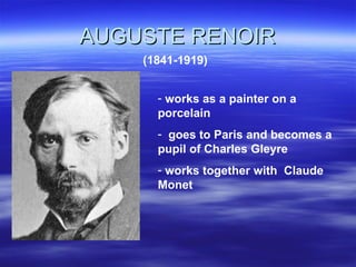 Renoir began his career painting porcelain but later studied under Charles Gleyre in Paris. He worked with Claude Monet and helped develop Impressionism from 1872 to 1883, capturing snapshots of real life with sparkling color and light. Rather than dark shadows, Renoir used tiny brushstrokes and patches of merging color to depict pretty scenes of women, children, and landscapes in a style meant to be appealing.