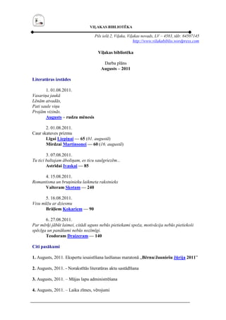 Pils ielā 2, Viļaka, Viļakas novads, LV – 4583, tālr. 64507145 http://www.vilakabiblio.wordpress.com Viļakas bibliotēka Darba plāns Augusts – 2011 Literatūras izstādes 1. 01.08.2011. Vasariņa jaukā Lēnām atvadās, Pati saule viņu Projām vizinās. Augusts – rudzu mēnesis 2. 01.08.2011. Caur skatuves prizmu Līgai Liepiņai — 65 (01. augustā) Mirdzai Martinsonei — 60 (16. augustā) 3. 07.08.2011. Tu tici baltajam āboliņam, es ticu saulgriezēm... Astrīdai Ivaskai — 85 4. 15.08.2011. Romantisma un bruņinieku laikmeta rakstnieks Valteram Skotam — 240 5. 16.08.2011. Visu mūžu ar dziesmu Brāļiem Kokariem — 90 6. 27.08.2011. Par mērķi jābūt laimei, citādi uguns nebūs pietiekami spoža, motivācija nebūs pietiekoši spēcīga un panākumi nebūs nozīmīgi. Teodoram Draizeram — 140 Citi pasākumi 1. Augusts, 2011. Ekspertu iesaistīšana lasīšanas maratonā „Bērnu/Jauniešu žūrija 2011” 2. Augusts, 2011. - Norakstītās literatūras aktu sastādīšana 3. Augusts, 2011. – Mājas lapu administrēšana 4. Augusts, 2011. – Laika zīmes, vērojumi
