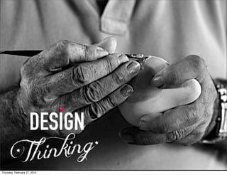 The document discusses the design thinking process, which includes 12 steps: defining the challenge, preparing research, obtaining inspiration, telling stories, seeking meaning, considering opportunities, generating ideas, refining ideas, building prototypes, getting feedback, evaluating learnings, and constructing experiences. It emphasizes principles of empathy, collaboration, and experimentation and encourages exploring new areas and acquiring inspiration.