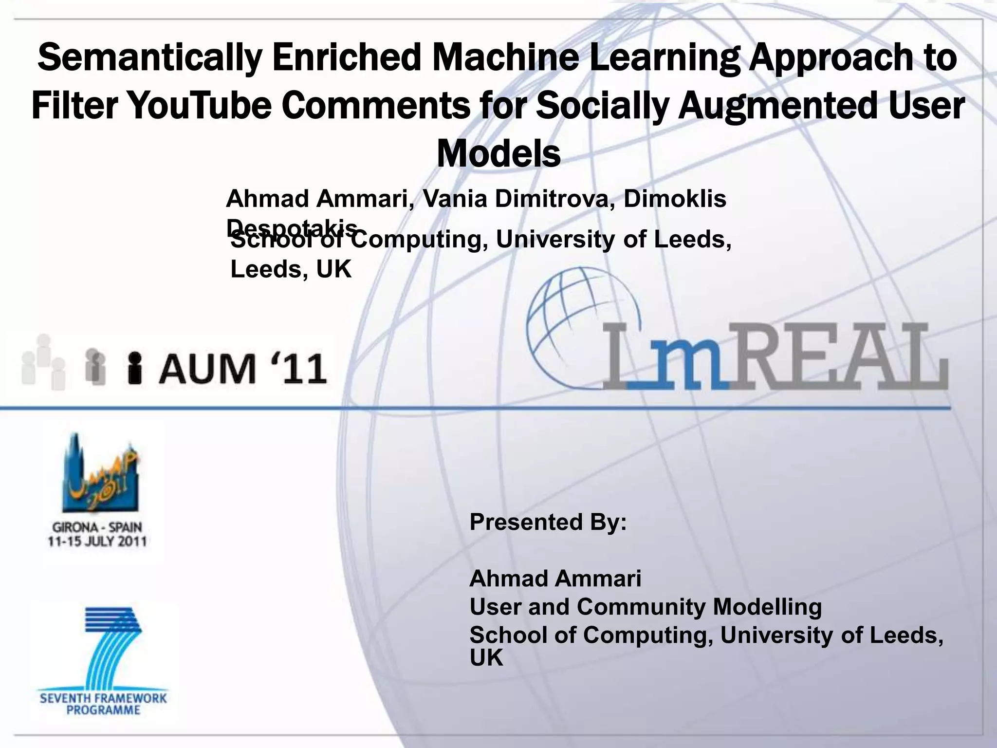 The document describes a machine learning approach to filter YouTube comments for socially augmented user models. It presents a semantically enriched machine learning method that uses a job interview bag of words to score and label training comments from YouTube videos about job interviews. The trained classifiers are then used to predict whether new comments are relevant or noise. Experimental results show the classifiers perform well, and a human evaluation finds the service effectively identifies comments showing awareness or interest in job interviews.
