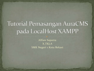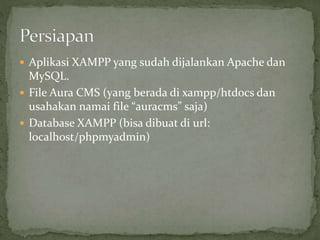 Dokumen ini memberikan instruksi untuk menginstalasi Aura CMS menggunakan XAMPP di localhost. Langkah-langkahnya adalah menjalankan Apache dan MySQL di XAMPP, menambahkan file Aura CMS ke folder htdocs, membuat database di phpmyadmin, dan mengakses konfigurasi instalasi melalui URL localhost yang akan memandu pengaturan database dan konfigurasi website.