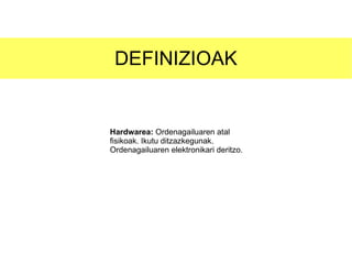Aurkezpena Hardwarea 1. 2. DEFINIZIOAK Hardwarea: Ordenagailuaren atal fisikoak. Ikutu ditzazkegunak. Ordenagailuaren elektronikari deritzo. 3. EBOLUZIOA Hiru epe bereiztuko ditugu: Konputagailuen sorrera: Ahalmen gutxikoak. Informazio gutzi prozesatu zezaketen. Ordenagailu pertsonalaren sorrera: Informatika etxeetara hedatzeko ezinbesteko tresna izan zen. Gaur egungo ordenagailuak: Informazioa lortzeko oso lagungarri zaizkigu.(internet) 4. 5. 6. 7. 8. 9. 10. 11. OSAGAIA NAGUSIAK Sarrerako gailuak edo periferikoak prozesatzeko Unitate Zentrala( PUZ) Irteerako gailuak edo periferikoak Informazio-euskarriak: 12.