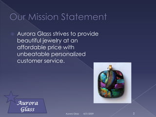 Aurora Glass is a small jewelry business that makes and sells dichroic glass jewelry such as pendants, earrings, bracelets, and rings. The business has been operating for almost 5 years and is run by three women who started the company in college. Aurora Glass strives to provide beautiful, affordable jewelry with personalized customer service and has won several artisan awards for their pieces.