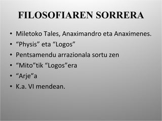 FILOSOFIAREN SORRERA MiletokoTales, Anaximandro eta Anaximenes. “ Physis” eta “Logos” Pentsamendu arrazionala sortu zen “ Mito”tik “Logos”era “ Arje”a K.a. VI mendean.