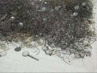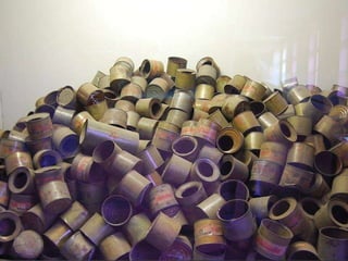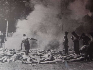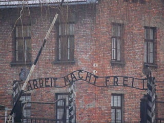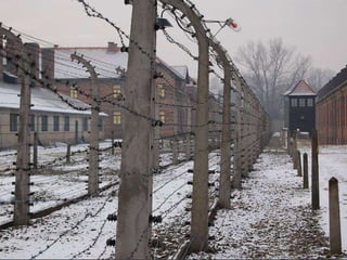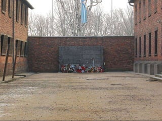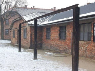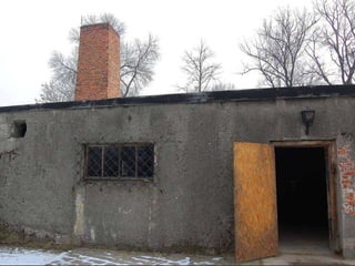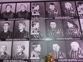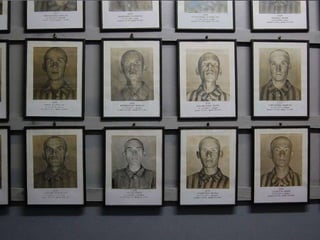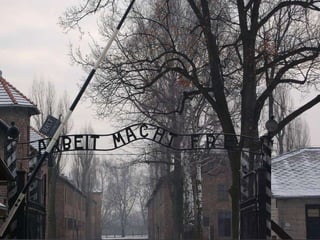 The document provides details about the Auschwitz concentration camp complex in Poland through a series of photos. It describes the "Arbeit Macht Frei" sign over the entrance, the crematorium that was converted from a Polish army bunker, the "courtyard of death" where executions by firing squad took place, glasses and shoes confiscated from prisoners, gas cans used to administer Zyklon B, a mountain of children's shoes, the hanging gallows, electrified fences surrounding the camps, cell block 10 where Dr. Josef Mengele conducted experiments, and mug shots of prisoners who died at the camps.